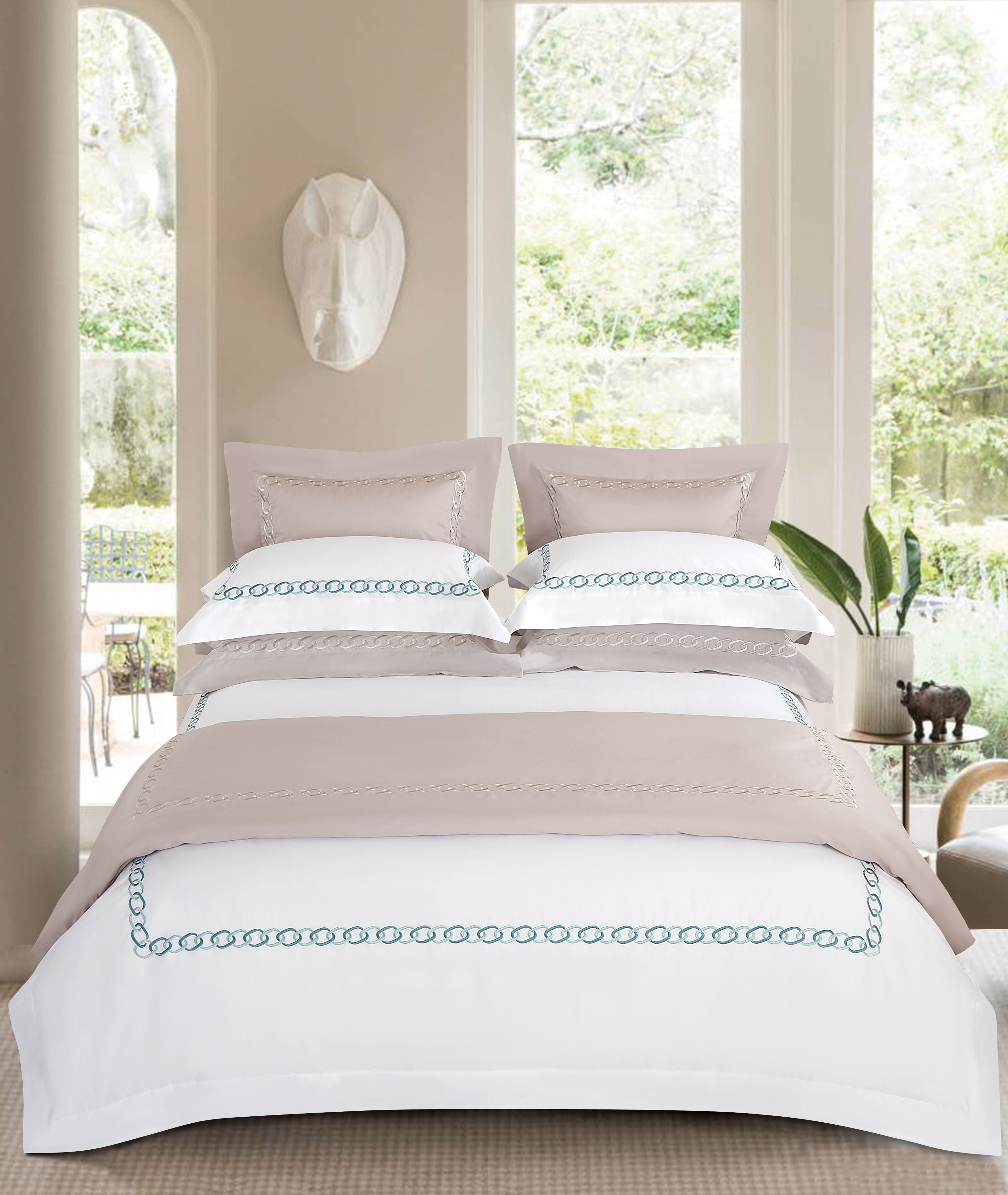 • 精美刺繡工藝:精致的鏈條刺繡設計,體現現代優(yōu)雅與奢華舒適相結合